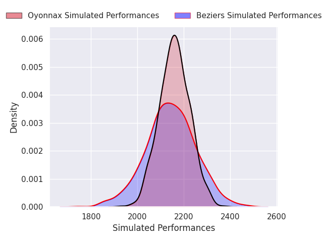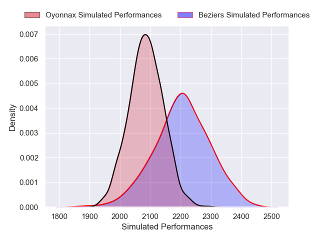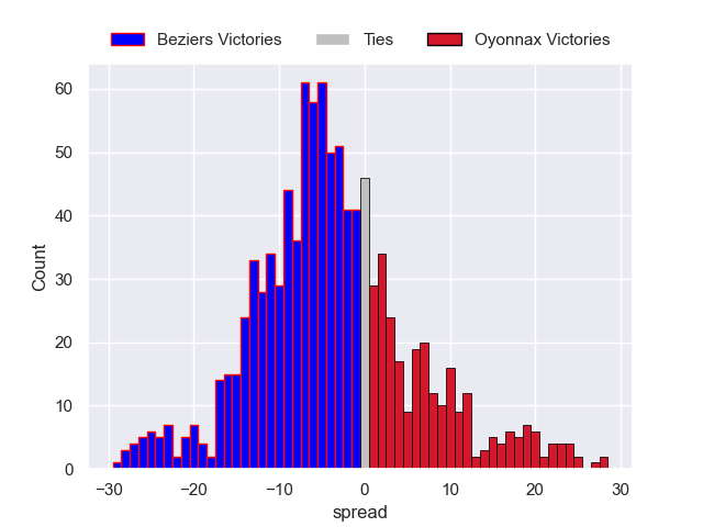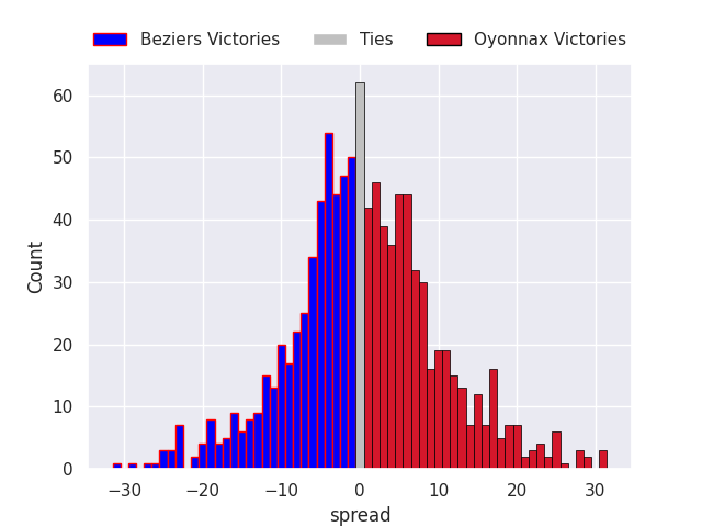 Each club has a rating and a rating deviation (similar to a Glicko rating), and expected performances can be generated. This allows for simulated matches and spreads like the ones below.