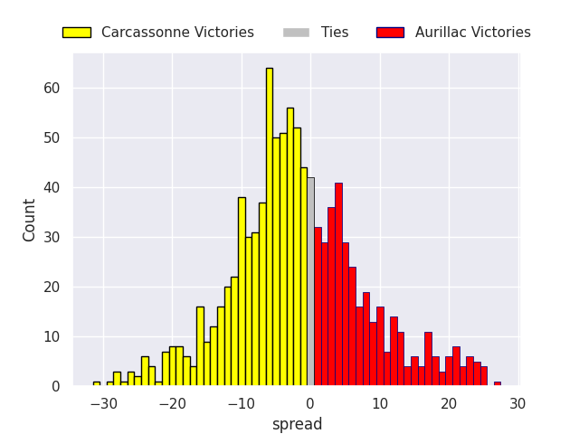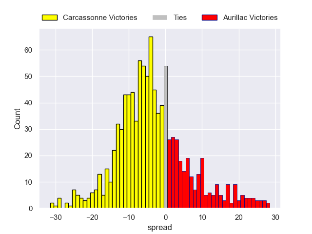 Each club has a rating and a rating deviation (similar to a Glicko rating), and expected performances can be generated. This allows for simulated matches and spreads like the ones below.