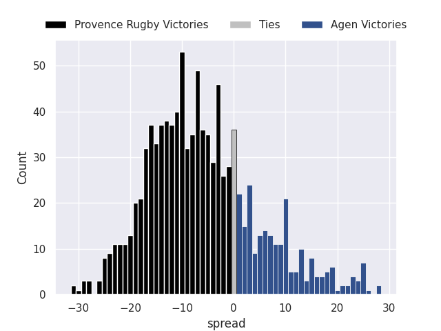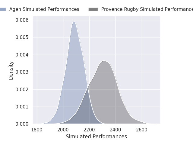 The first set of predictions treats a club as the smallest object, as the club develops its members, organizes a gameplan, and deploys its players as needed for each match. This club model is currently predicting Provence Rugby to win by 6.13.
