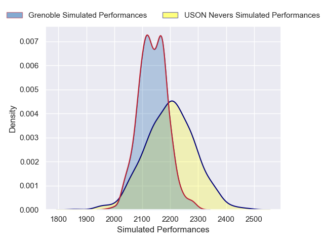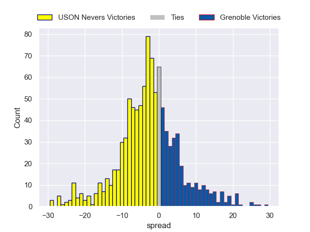 Each club has a rating and a rating deviation (similar to a Glicko rating), and expected performances can be generated. This allows for simulated matches and spreads like the ones below.