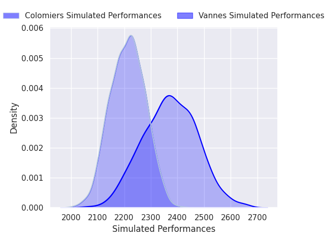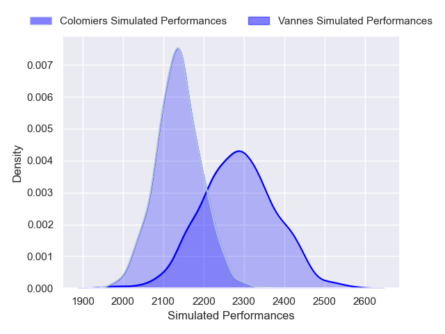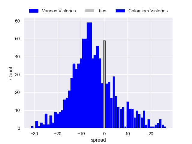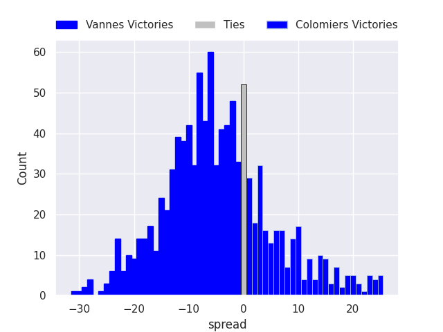Each club has a rating and a rating deviation (similar to a Glicko rating), and expected performances can be generated. This allows for simulated matches and spreads like the ones below.