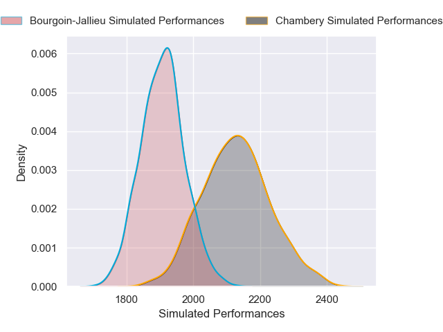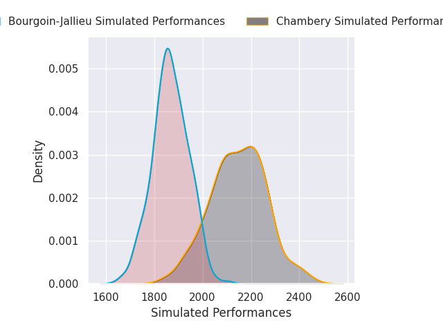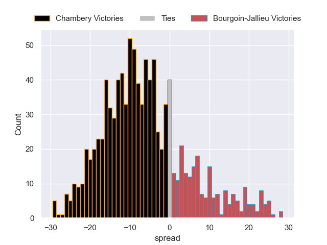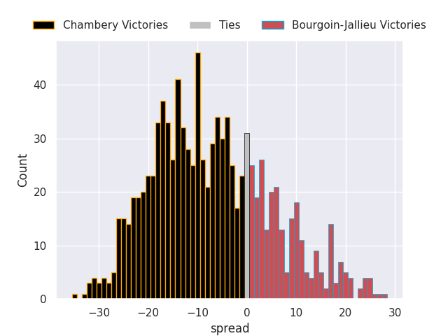 Each club has a rating and a rating deviation (similar to a Glicko rating), and expected performances can be generated. This allows for simulated matches and spreads like the ones below.
