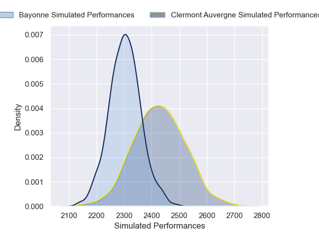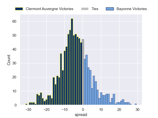 Each club has a rating and a rating deviation (similar to a Glicko rating), and expected performances can be generated. This allows for simulated matches and spreads like the ones below.