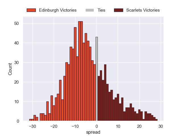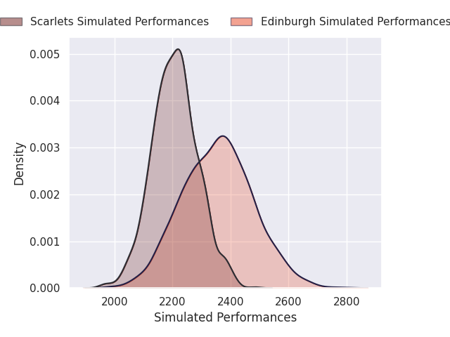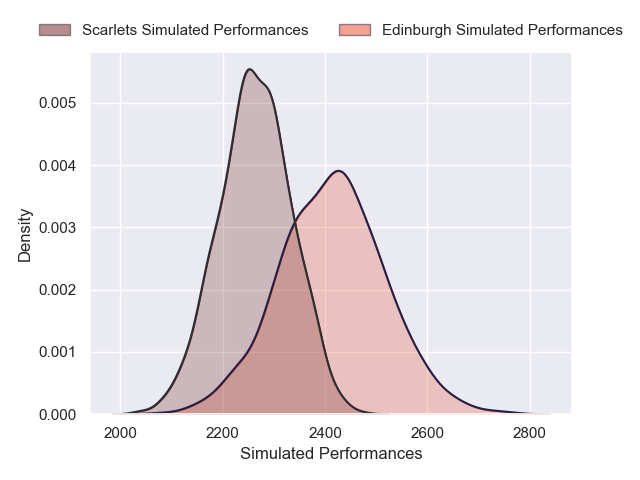 Each club has a rating and a rating deviation (similar to a Glicko rating), and expected performances can be generated. This allows for simulated matches and spreads like the ones below.