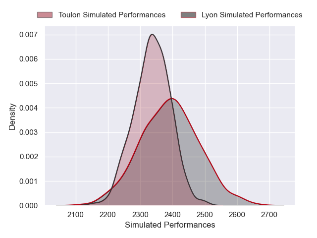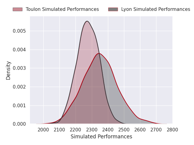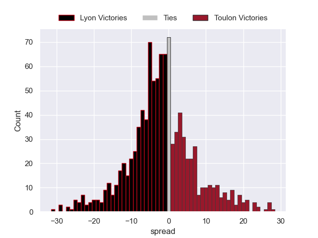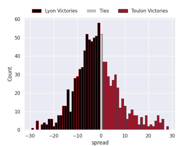 Each club has a rating and a rating deviation (similar to a Glicko rating), and expected performances can be generated. This allows for simulated matches and spreads like the ones below.