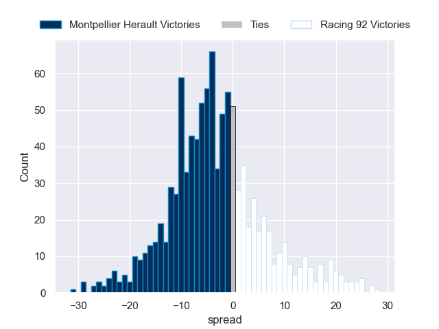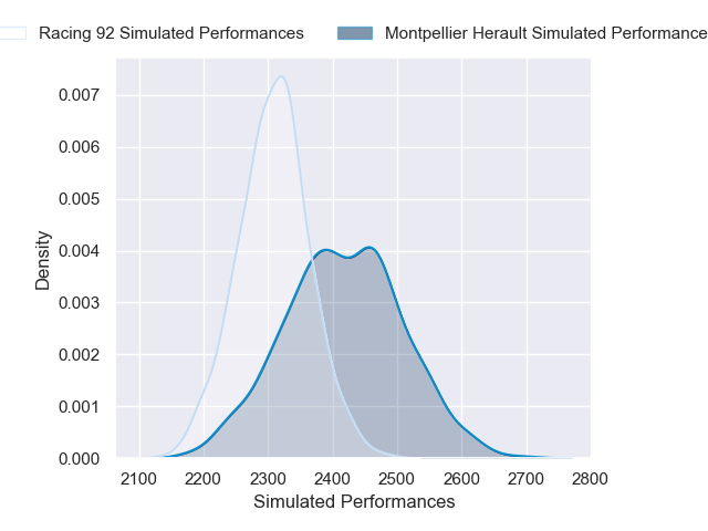 Each club has a rating and a rating deviation (similar to a Glicko rating), and expected performances can be generated. This allows for simulated matches and spreads like the ones below.
