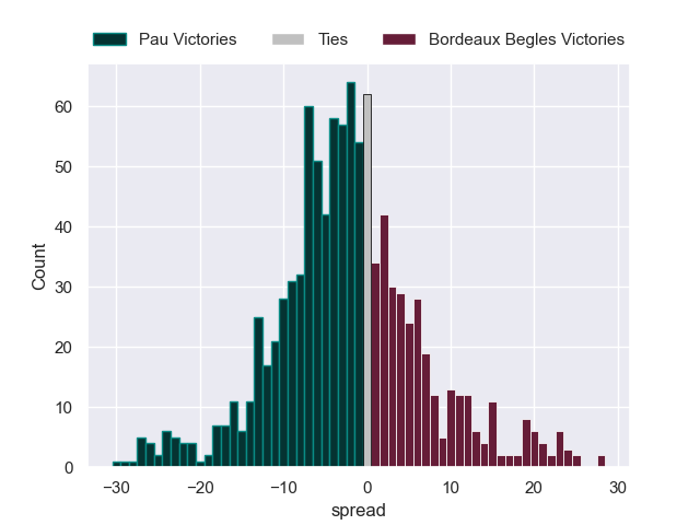 The first set of predictions treats a club as the smallest object, as the club develops its members, organizes a gameplan, and deploys its players as needed for each match. This club model is currently predicting Pau to win by 2.22.