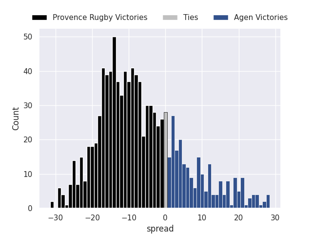 Each club has a rating and a rating deviation (similar to a Glicko rating), and expected performances can be generated. This allows for simulated matches and spreads like the ones below.