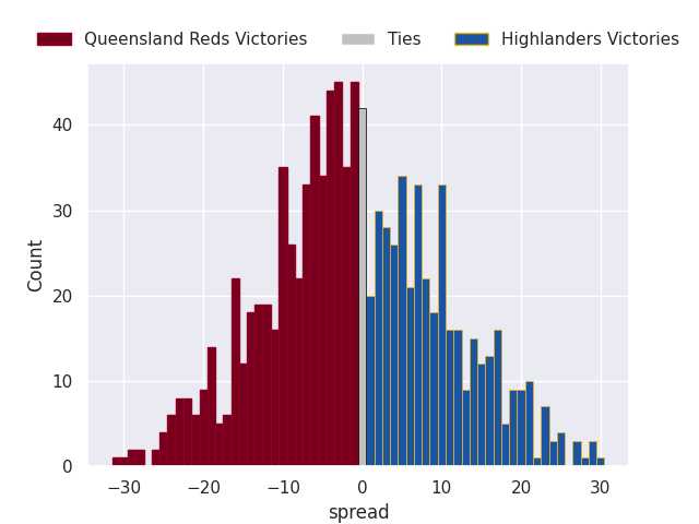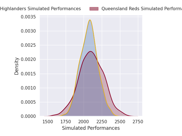 Each club has a rating and a rating deviation (similar to a Glicko rating), and expected performances can be generated. This allows for simulated matches and spreads like the ones below.