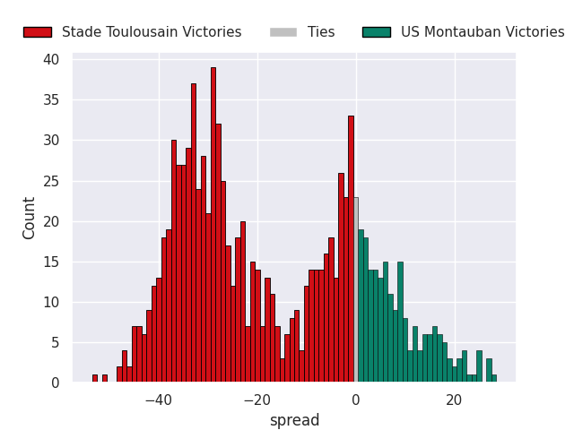 Each club has a rating and a rating deviation (similar to a Glicko rating), and expected performances can be generated. This allows for simulated matches and spreads like the ones below.