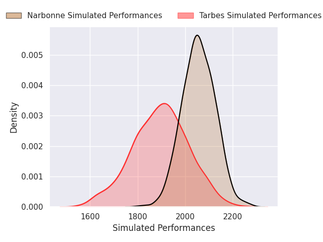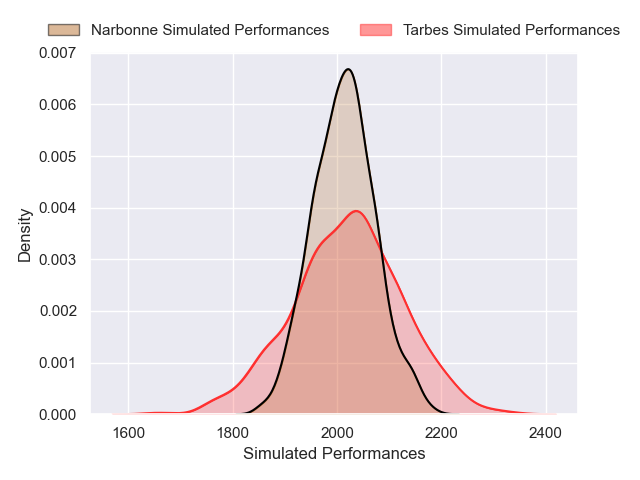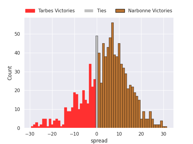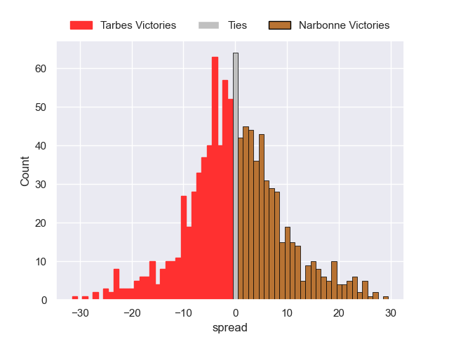 Each club has a rating and a rating deviation (similar to a Glicko rating), and expected performances can be generated. This allows for simulated matches and spreads like the ones below.