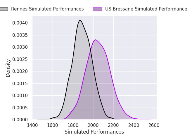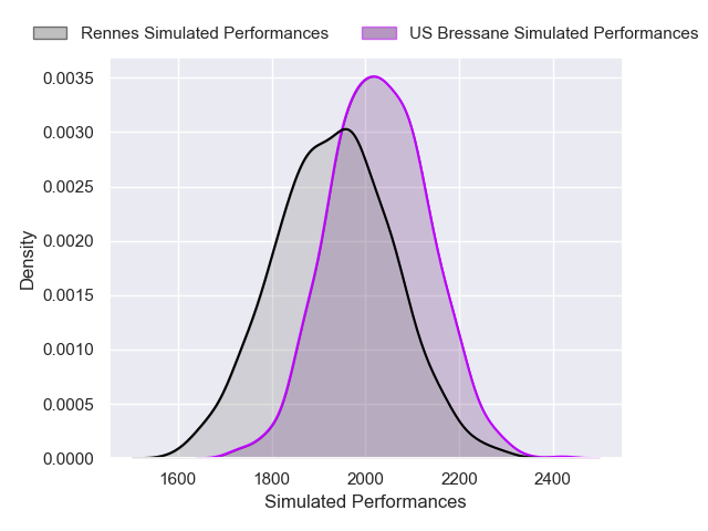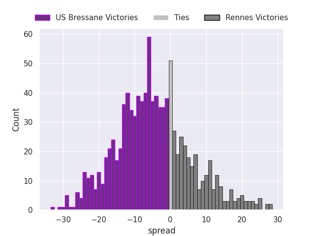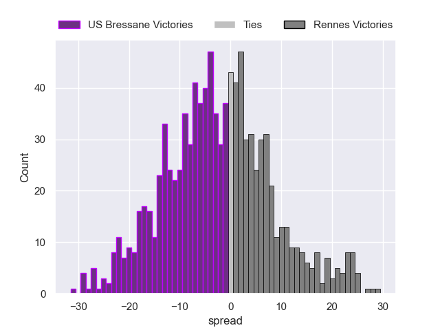 Each club has a rating and a rating deviation (similar to a Glicko rating), and expected performances can be generated. This allows for simulated matches and spreads like the ones below.