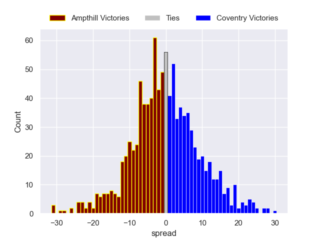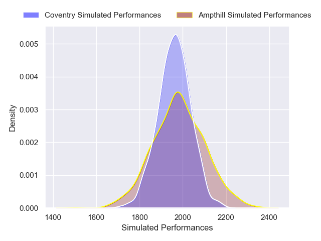 Each club has a rating and a rating deviation (similar to a Glicko rating), and expected performances can be generated. This allows for simulated matches and spreads like the ones below.