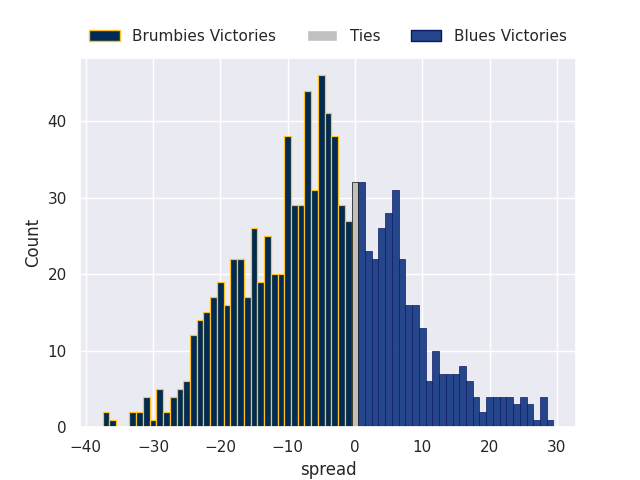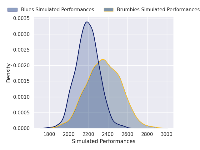 Each club has a rating and a rating deviation (similar to a Glicko rating), and expected performances can be generated. This allows for simulated matches and spreads like the ones below.