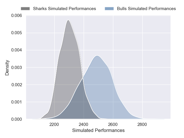 Each club has a rating and a rating deviation (similar to a Glicko rating), and expected performances can be generated. This allows for simulated matches and spreads like the ones below.