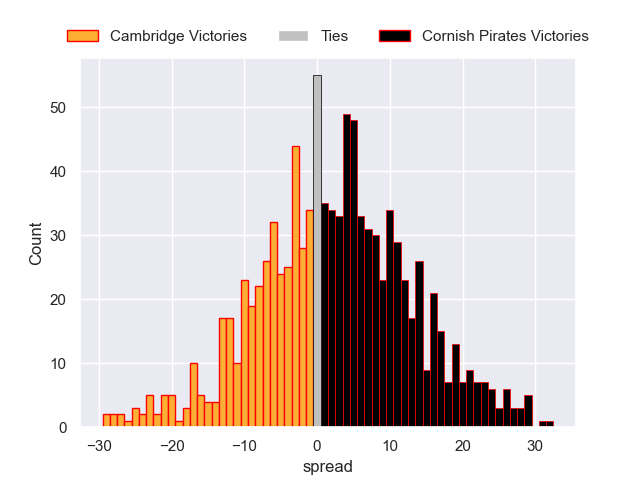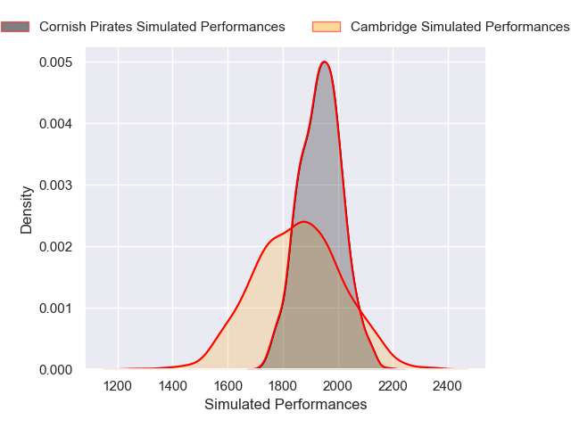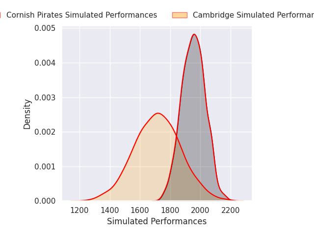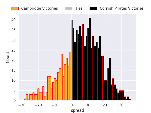 Each club has a rating and a rating deviation (similar to a Glicko rating), and expected performances can be generated. This allows for simulated matches and spreads like the ones below.