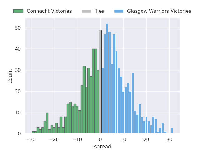 Each club has a rating and a rating deviation (similar to a Glicko rating), and expected performances can be generated. This allows for simulated matches and spreads like the ones below.