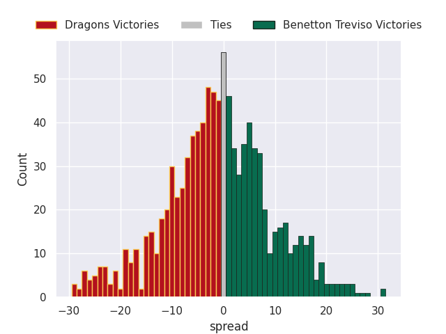 Each club has a rating and a rating deviation (similar to a Glicko rating), and expected performances can be generated. This allows for simulated matches and spreads like the ones below.