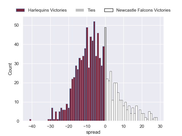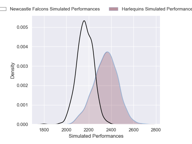 Each club has a rating and a rating deviation (similar to a Glicko rating), and expected performances can be generated. This allows for simulated matches and spreads like the ones below.