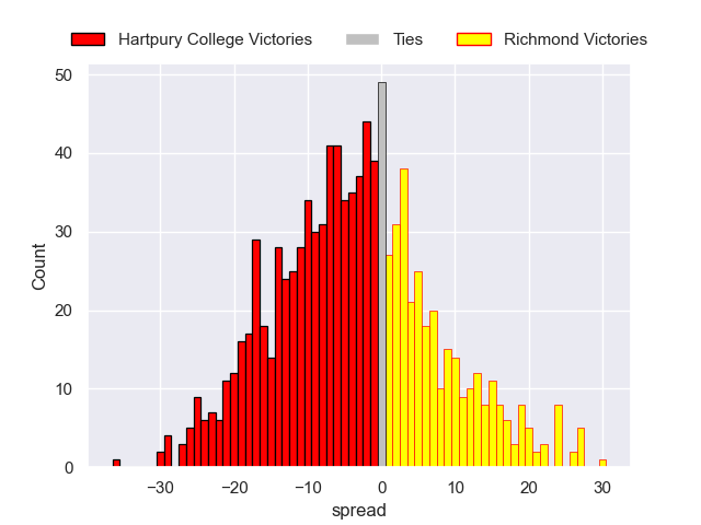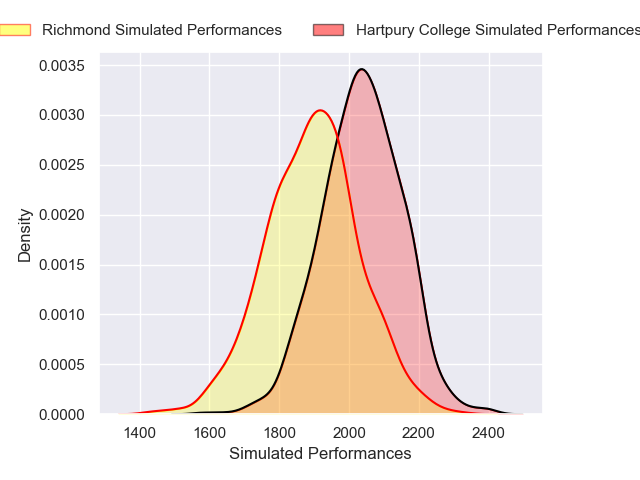 Each club has a rating and a rating deviation (similar to a Glicko rating), and expected performances can be generated. This allows for simulated matches and spreads like the ones below.