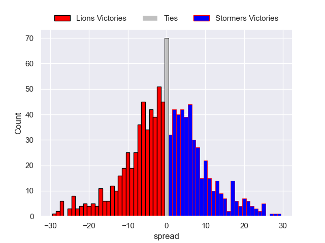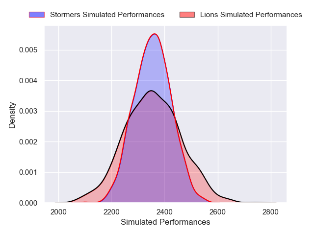 Each club has a rating and a rating deviation (similar to a Glicko rating), and expected performances can be generated. This allows for simulated matches and spreads like the ones below.