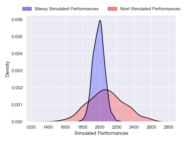 Each club has a rating and a rating deviation (similar to a Glicko rating), and expected performances can be generated. This allows for simulated matches and spreads like the ones below.