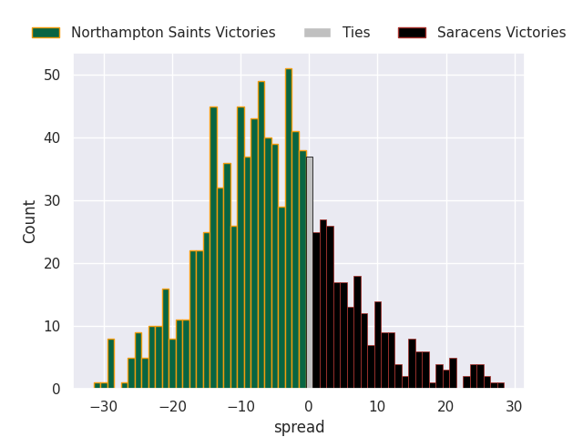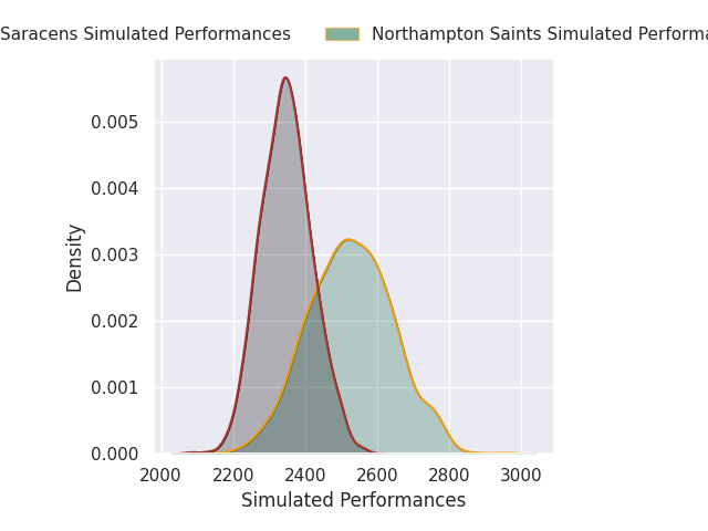 Each club has a rating and a rating deviation (similar to a Glicko rating), and expected performances can be generated. This allows for simulated matches and spreads like the ones below.