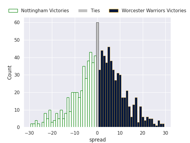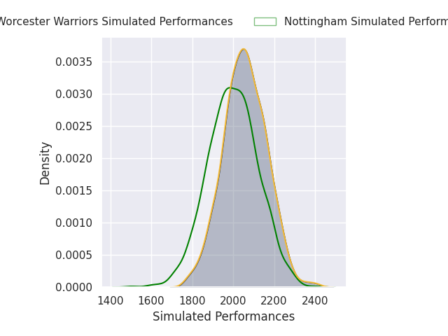 Each club has a rating and a rating deviation (similar to a Glicko rating), and expected performances can be generated. This allows for simulated matches and spreads like the ones below.
