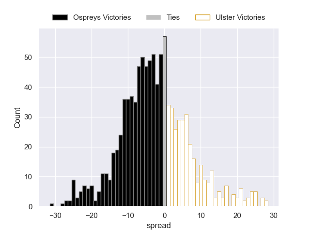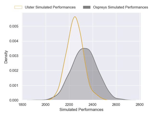 Each club has a rating and a rating deviation (similar to a Glicko rating), and expected performances can be generated. This allows for simulated matches and spreads like the ones below.