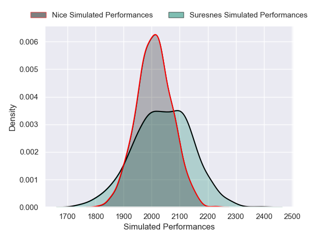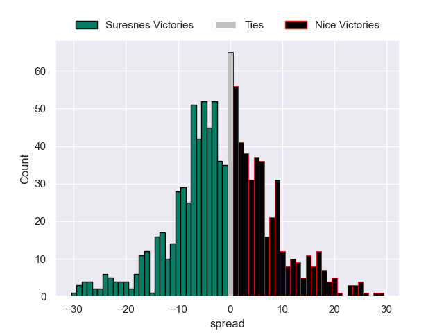 Each club has a rating and a rating deviation (similar to a Glicko rating), and expected performances can be generated. This allows for simulated matches and spreads like the ones below.