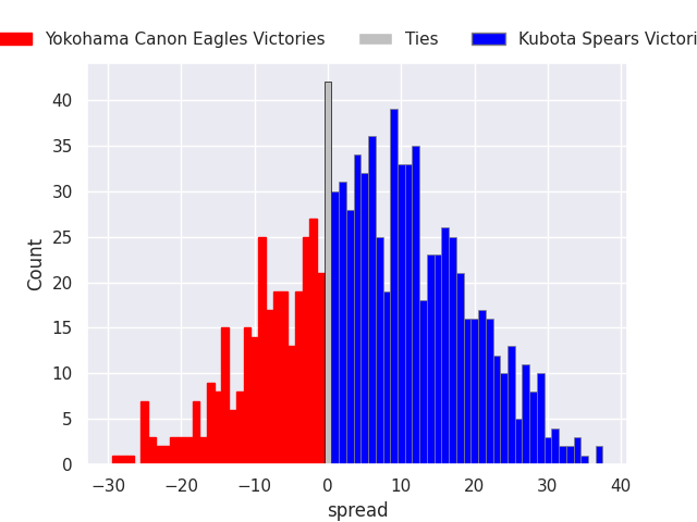The second set of predictions is based around the players themselves - each player gets a rating, and their contribution is weighted by their time on the field. The player model is currently predicting Kubota Spears to win by 5.64