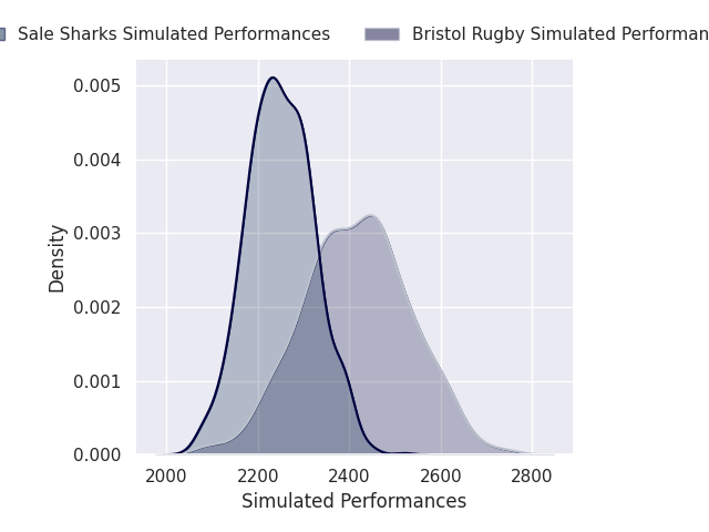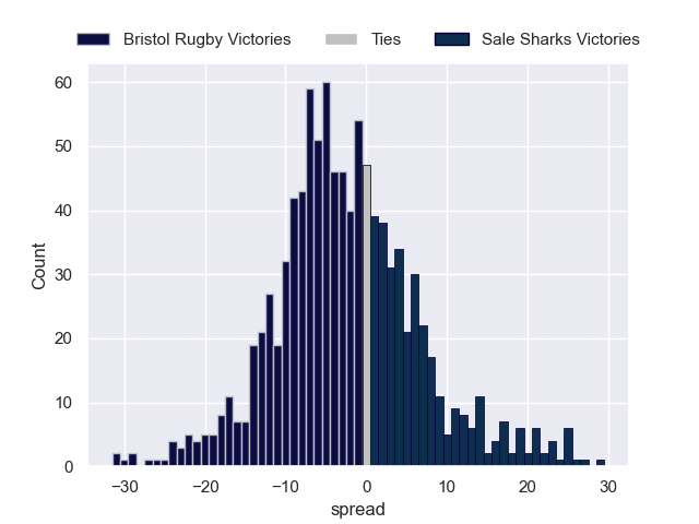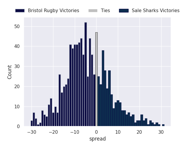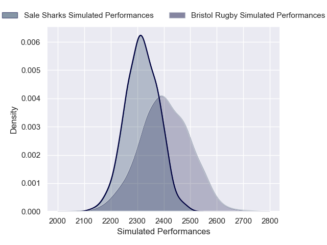 Each club has a rating and a rating deviation (similar to a Glicko rating), and expected performances can be generated. This allows for simulated matches and spreads like the ones below.