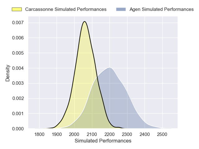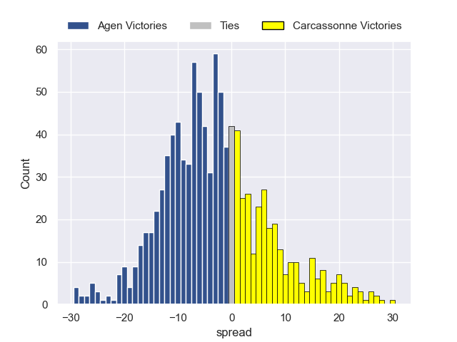 Each club has a rating and a rating deviation (similar to a Glicko rating), and expected performances can be generated. This allows for simulated matches and spreads like the ones below.