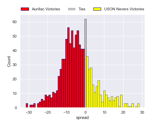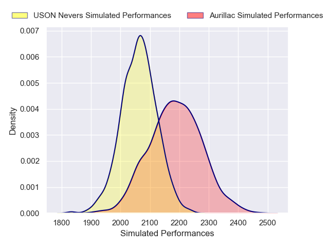Each club has a rating and a rating deviation (similar to a Glicko rating), and expected performances can be generated. This allows for simulated matches and spreads like the ones below.