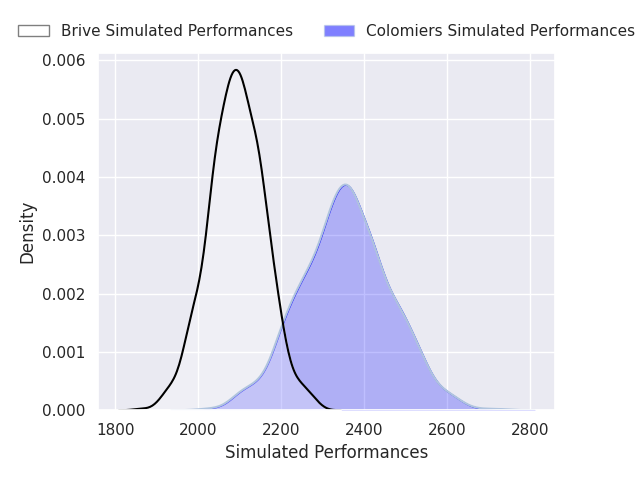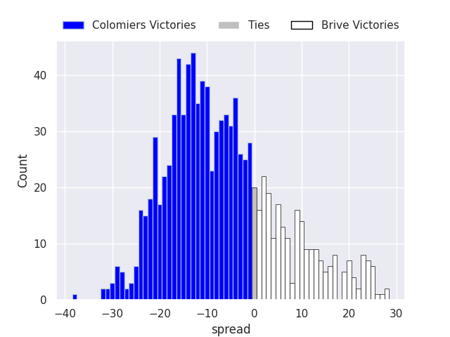 Each club has a rating and a rating deviation (similar to a Glicko rating), and expected performances can be generated. This allows for simulated matches and spreads like the ones below.