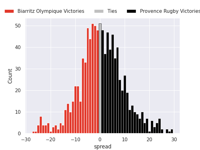 Each club has a rating and a rating deviation (similar to a Glicko rating), and expected performances can be generated. This allows for simulated matches and spreads like the ones below.