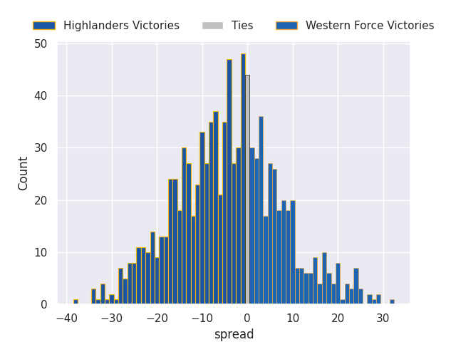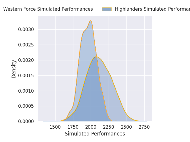 Each club has a rating and a rating deviation (similar to a Glicko rating), and expected performances can be generated. This allows for simulated matches and spreads like the ones below.