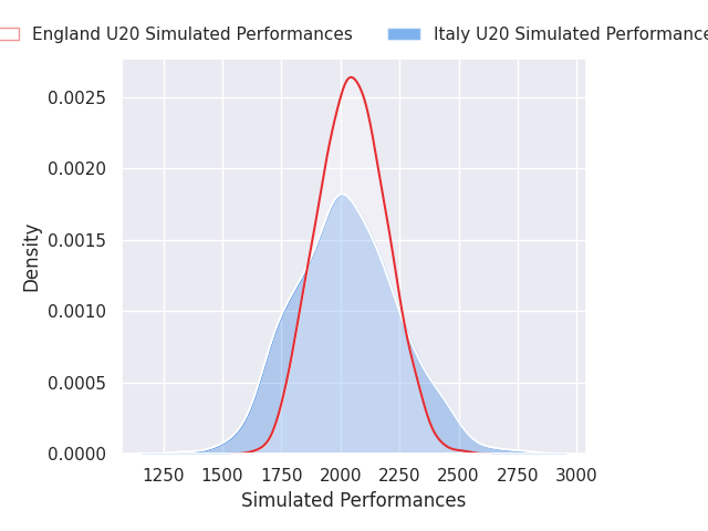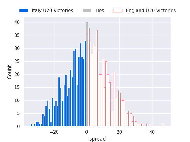Each club has a rating and a rating deviation (similar to a Glicko rating), and expected performances can be generated. This allows for simulated matches and spreads like the ones below.