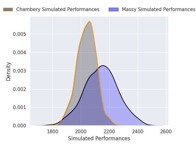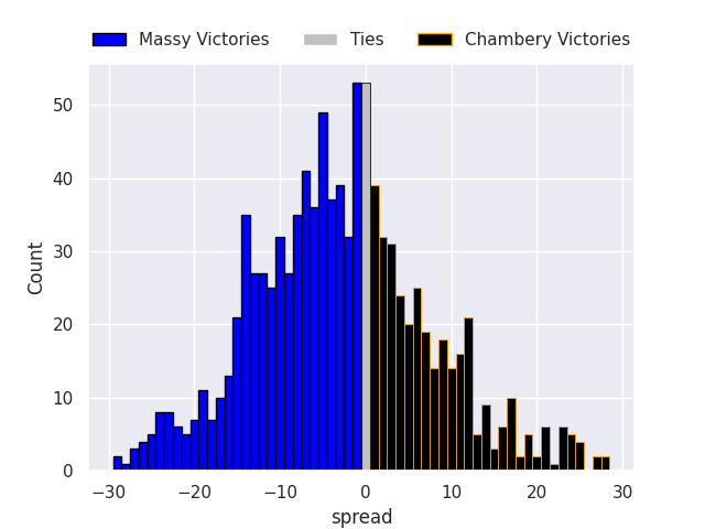 Each club has a rating and a rating deviation (similar to a Glicko rating), and expected performances can be generated. This allows for simulated matches and spreads like the ones below.