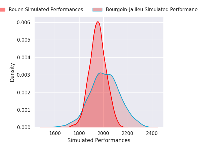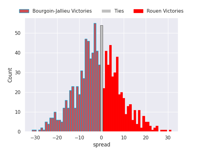 Each club has a rating and a rating deviation (similar to a Glicko rating), and expected performances can be generated. This allows for simulated matches and spreads like the ones below.
