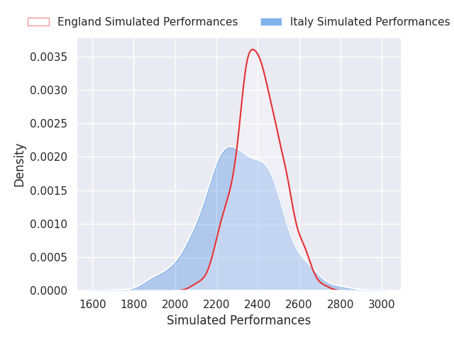 Each club has a rating and a rating deviation (similar to a Glicko rating), and expected performances can be generated. This allows for simulated matches and spreads like the ones below.