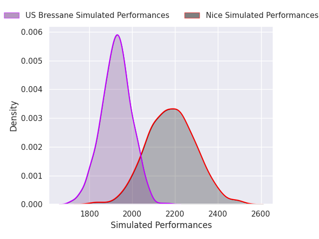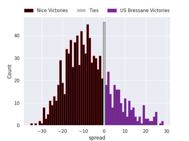 Each club has a rating and a rating deviation (similar to a Glicko rating), and expected performances can be generated. This allows for simulated matches and spreads like the ones below.
