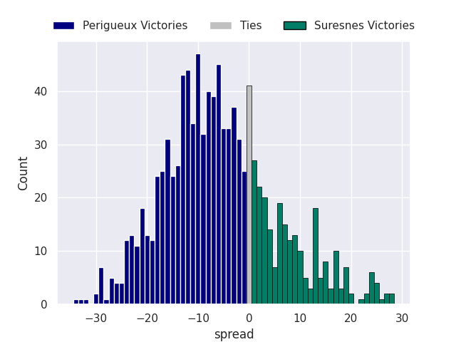 Each club has a rating and a rating deviation (similar to a Glicko rating), and expected performances can be generated. This allows for simulated matches and spreads like the ones below.
