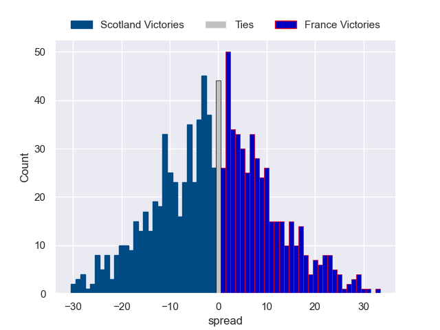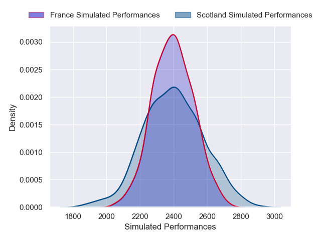 Each club has a rating and a rating deviation (similar to a Glicko rating), and expected performances can be generated. This allows for simulated matches and spreads like the ones below.