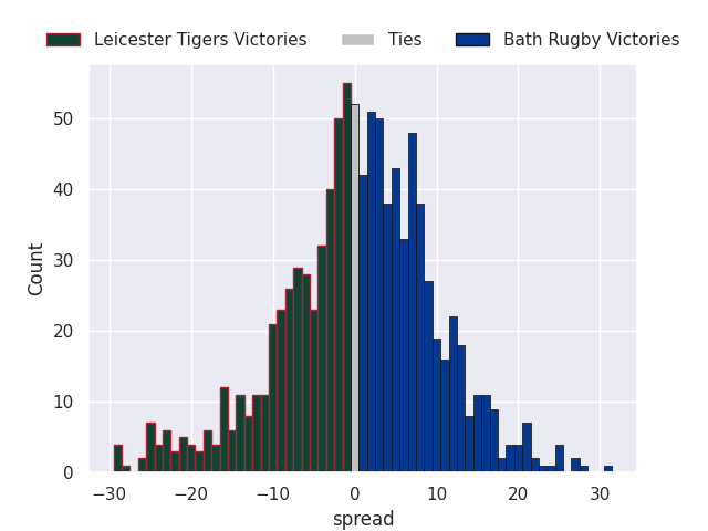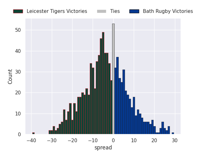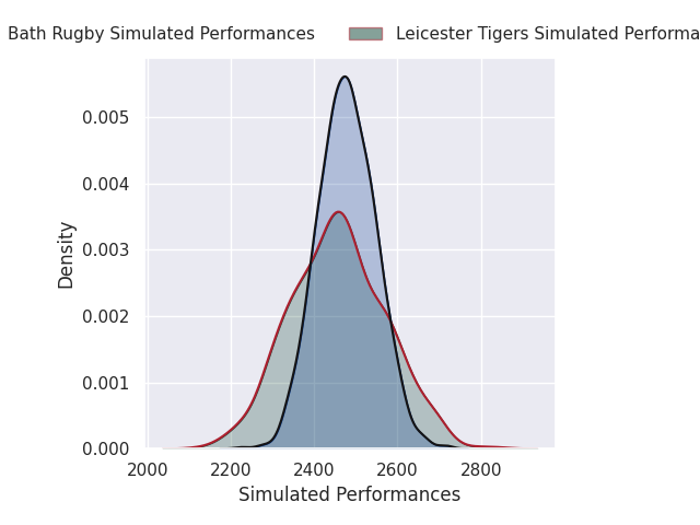 Each club has a rating and a rating deviation (similar to a Glicko rating), and expected performances can be generated. This allows for simulated matches and spreads like the ones below.