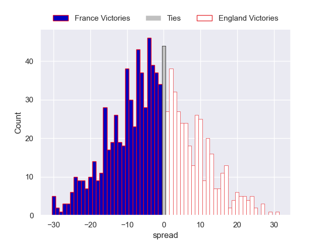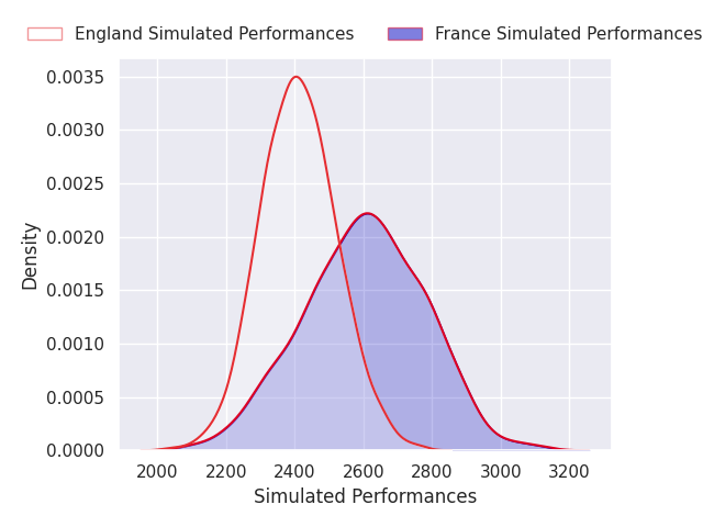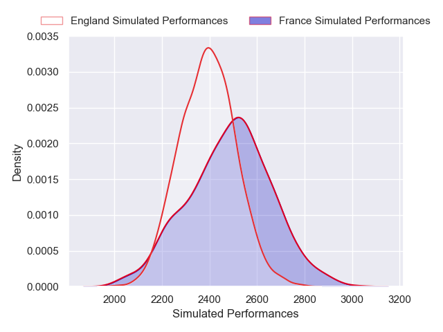 Each club has a rating and a rating deviation (similar to a Glicko rating), and expected performances can be generated. This allows for simulated matches and spreads like the ones below.