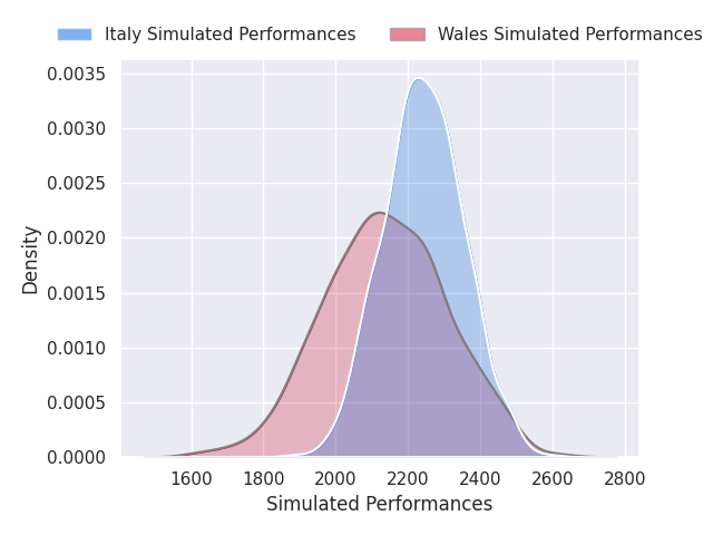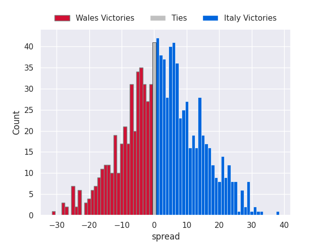 Each club has a rating and a rating deviation (similar to a Glicko rating), and expected performances can be generated. This allows for simulated matches and spreads like the ones below.