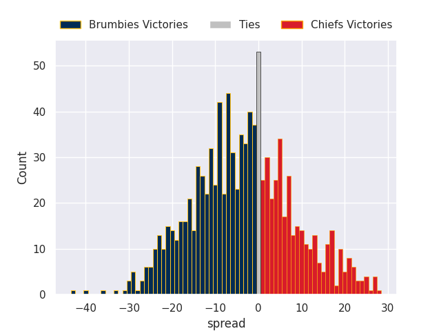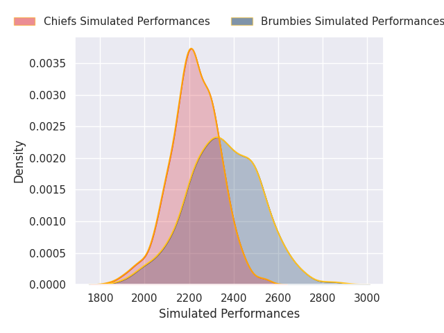 Each club has a rating and a rating deviation (similar to a Glicko rating), and expected performances can be generated. This allows for simulated matches and spreads like the ones below.