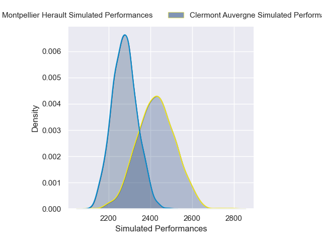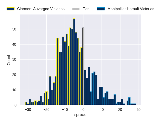 Each club has a rating and a rating deviation (similar to a Glicko rating), and expected performances can be generated. This allows for simulated matches and spreads like the ones below.