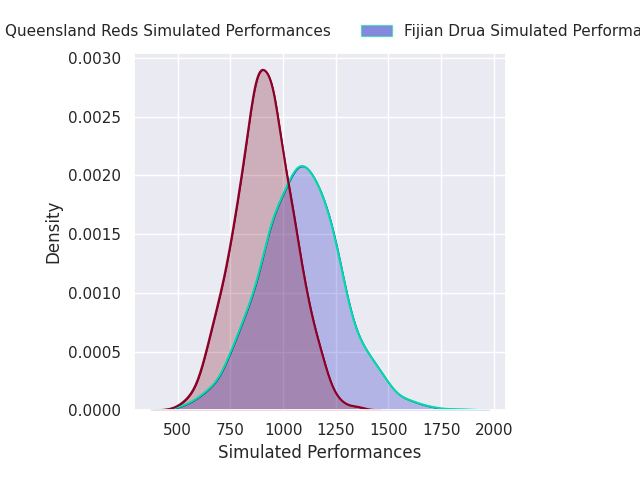 Each club has a rating and a rating deviation (similar to a Glicko rating), and expected performances can be generated. This allows for simulated matches and spreads like the ones below.